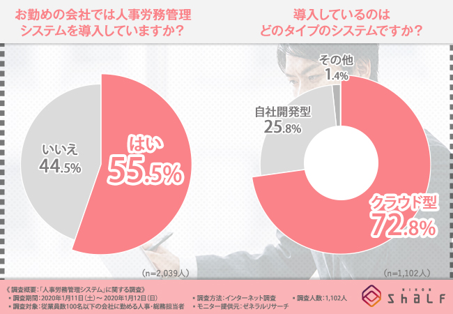 1人事・総務担当者1102人が回答株式会社日本シャルフは、「人事労務管理システム」に関する調査を実施し、その結果概要を2020年2月12日に発表した。