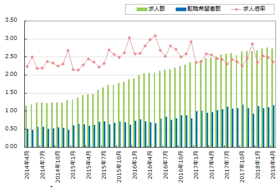 1名に対して、中途採用の求人が何件あるかパーソルキャリア株式会社が運営する転職サービス『DODA』は、2018年5月14日、2018年4月の転職求人倍率をまとめた『DODA 転職求人倍率レポート』を発表した。