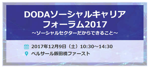 社会課題の解決に取り組む「ソーシャルビジネス」11月20日、パーソルキャリア株式会社は、「DODAソーシャルキャリアフォーラム2017」のイベントを12月9日に開催すると発表した。「ソーシャルビジネス」の現状を知り、キャリアについて考えるとある。