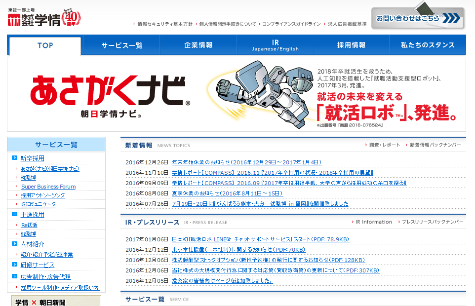「就活ロボ」による就活支援1月6日、株式会社学情は、新卒採用業界初の機能を搭載する「就活ロボLINE@チャットサポートサービス」を「あさがくナビ2018」で開始することを発表した。「24時間対応のAI(人工知能)のアドバイザー」が就活を支援する。